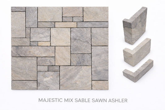 Majestic Mix Sable Sawn Ashlar is a premium natural stone featuring a refined blend of sable brown, beige, and subtle earthy tones. The natural color variation creates depth and warmth, giving the stone a rich and sophisticated appearance suitable for both modern and classic architectural styles. The precision sawn finish...
